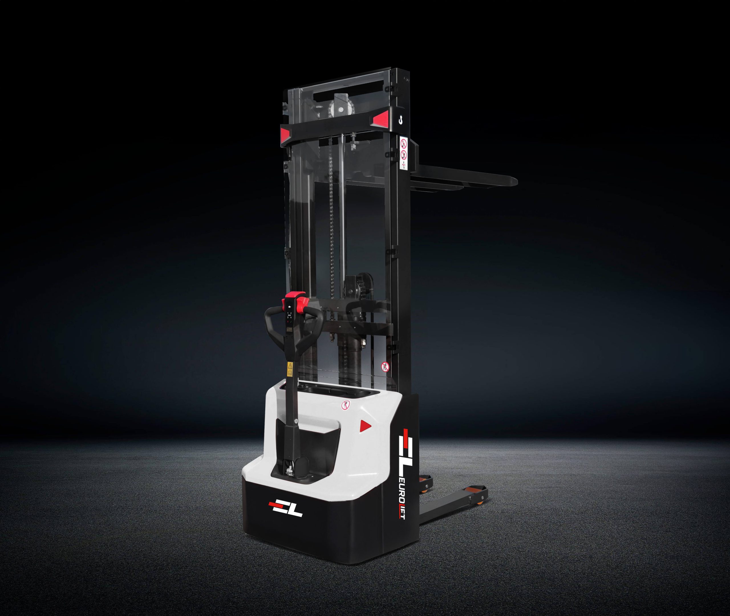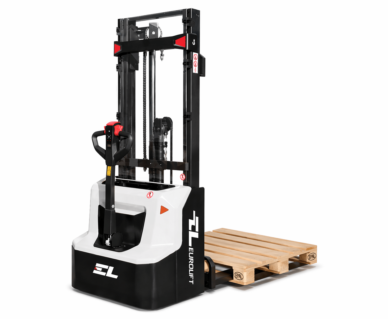 Transpaletă full electrică pietonală EUROLIFT 1.3 tone, catarg triplex, ridicare 4.3 m
